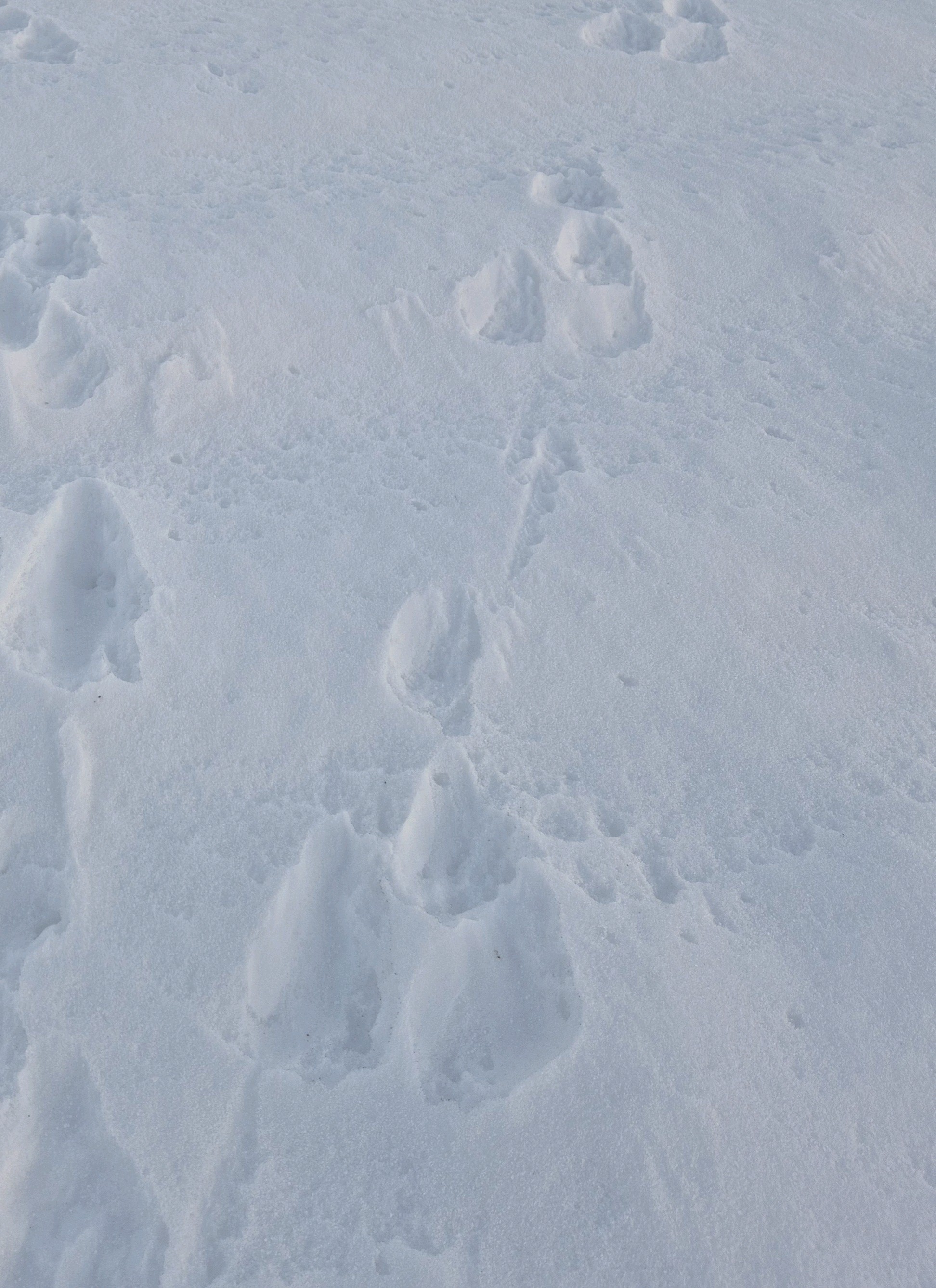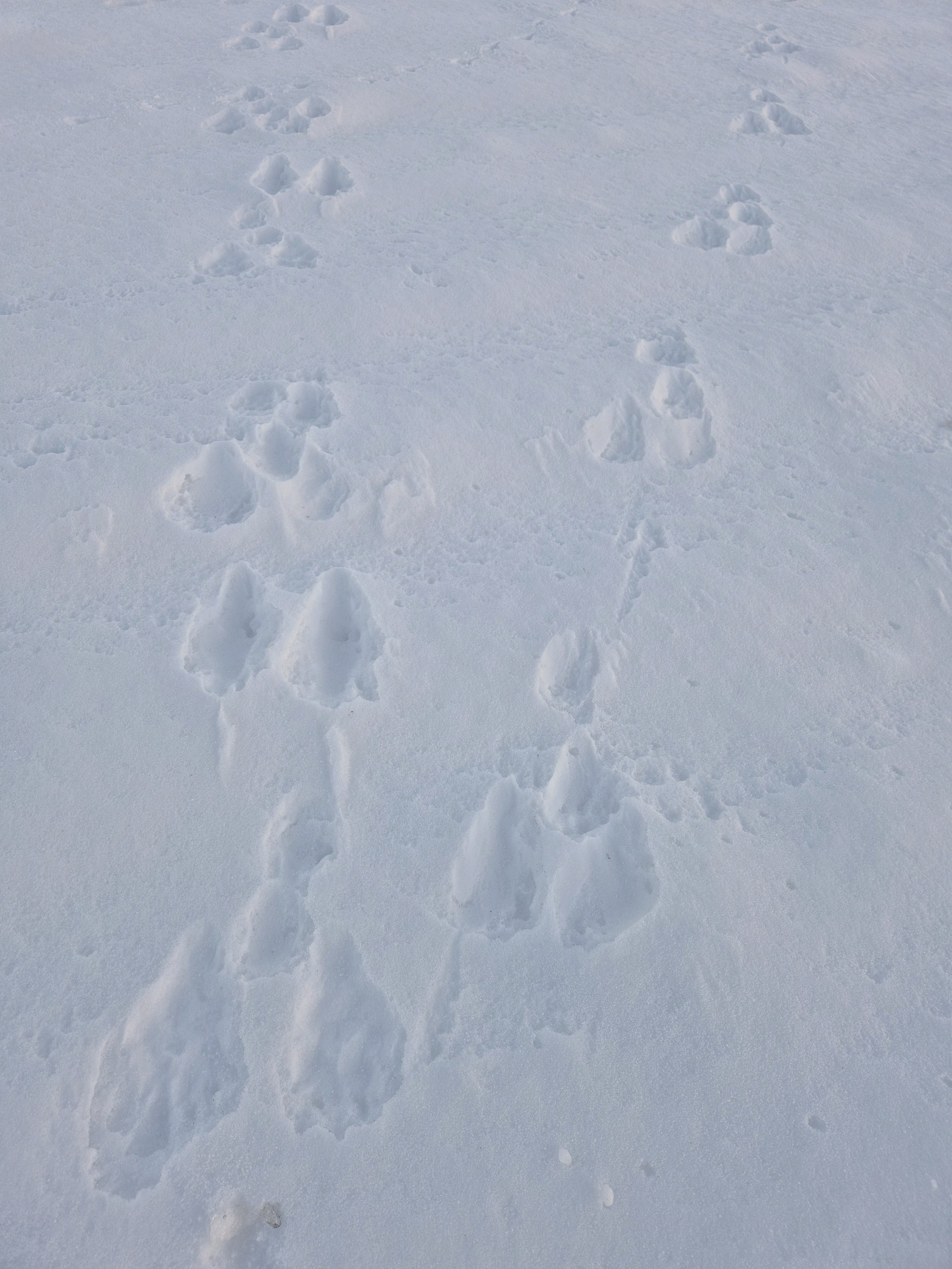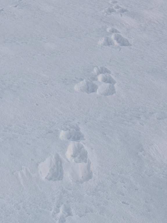 På en hare vil de to poter ved siden af hinanden være bagben og afsat senest i et spring. Her ser det ud til at den pote lige bagved er afsat senest, har skubbet sneen lidt frem i det ene af de to ved siden af hinanden. Det tyder mere på en Mår, så de to ved siden af hinanden er forpoter og en bagpote ved landing skubber lidt sne frem , mens forpoten er begyndt at løfte sig til næste spring.
