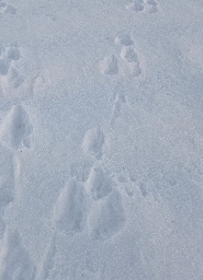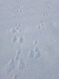 Billedet er taget på marken ved vores hus. Vi havde slet ikke tænkt på mår, selv om vi har den på loftet (vi hører den tit, men ser den sjældent). Vi har hare på marken (som vi ser en gang i mellem). Kan man sige noget ud fra "kursen"? Har en hare en lidt mere målrettet færd end måren, som kunne tænkes også at være lidt mere "rundt på gulvet" på marken - ligesom den er på loftet? Vi aner det absolut ikke :-)