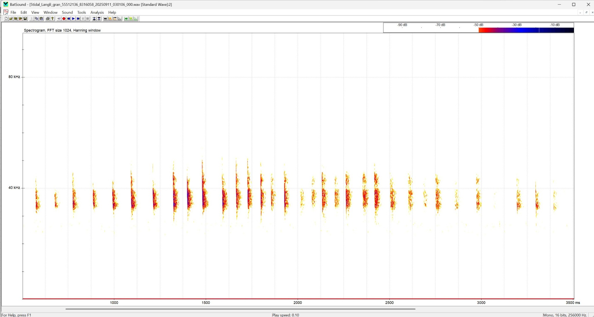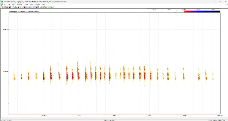 Sonogram: de enkelte frekvensmodulerede orienteringsskrig begynder ved 65-85 kHz og ender ved 25-35 kHz. Desuden længere (15-25 ms) artstypiske skrig med næsten konstant frekvens på ca. 35 kHz og en karakteristisk afslutning.