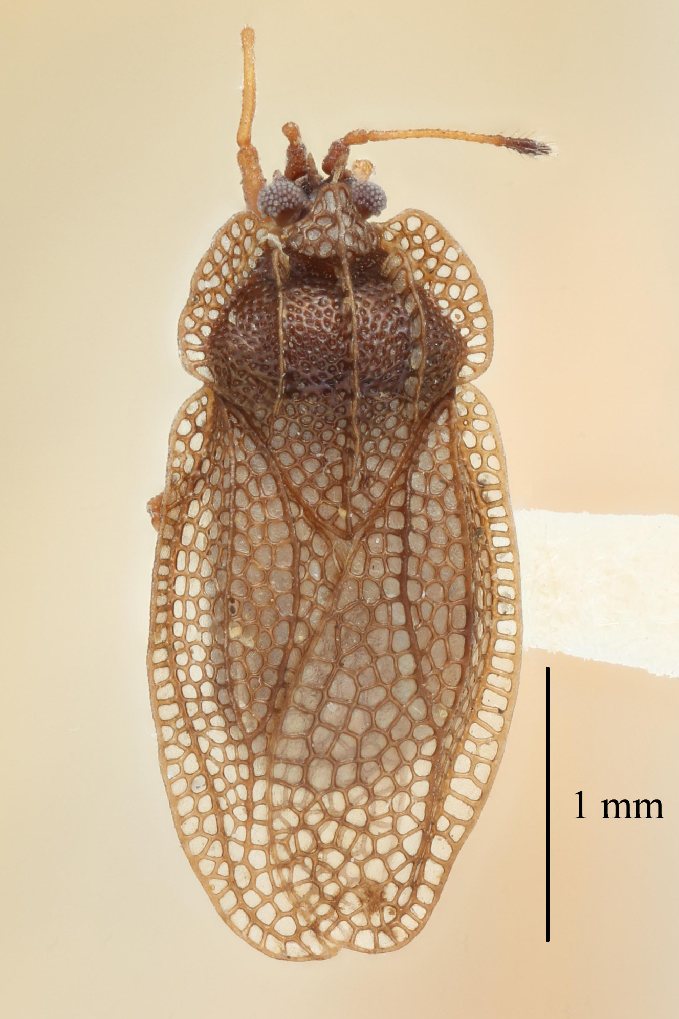 Længde 2,1-3,2 mm. Kortvinget, kun sjældent langvinget. Langvingede former 2,8-3,2 mm (♀); kortvingede former 2,1-2,4 mm (♂♀). Pronotum, pronotums sidelapper, halvdækvinger, antenneled og ben er brune til gråbrune. Hovedet og det 4. antenneled er mørkere. Tornene på hovedet er lange og divergerende. Pronotum har 3 køle, og hætten er forlænget fremad og dækker hovedet næsten til roden af tornene. Pronotums sidelapper har ofte 3 rækker celler, og den største del af halvdækvingernes siderande har 1 række celler. Alle antenneleddene har samme bredde overalt.