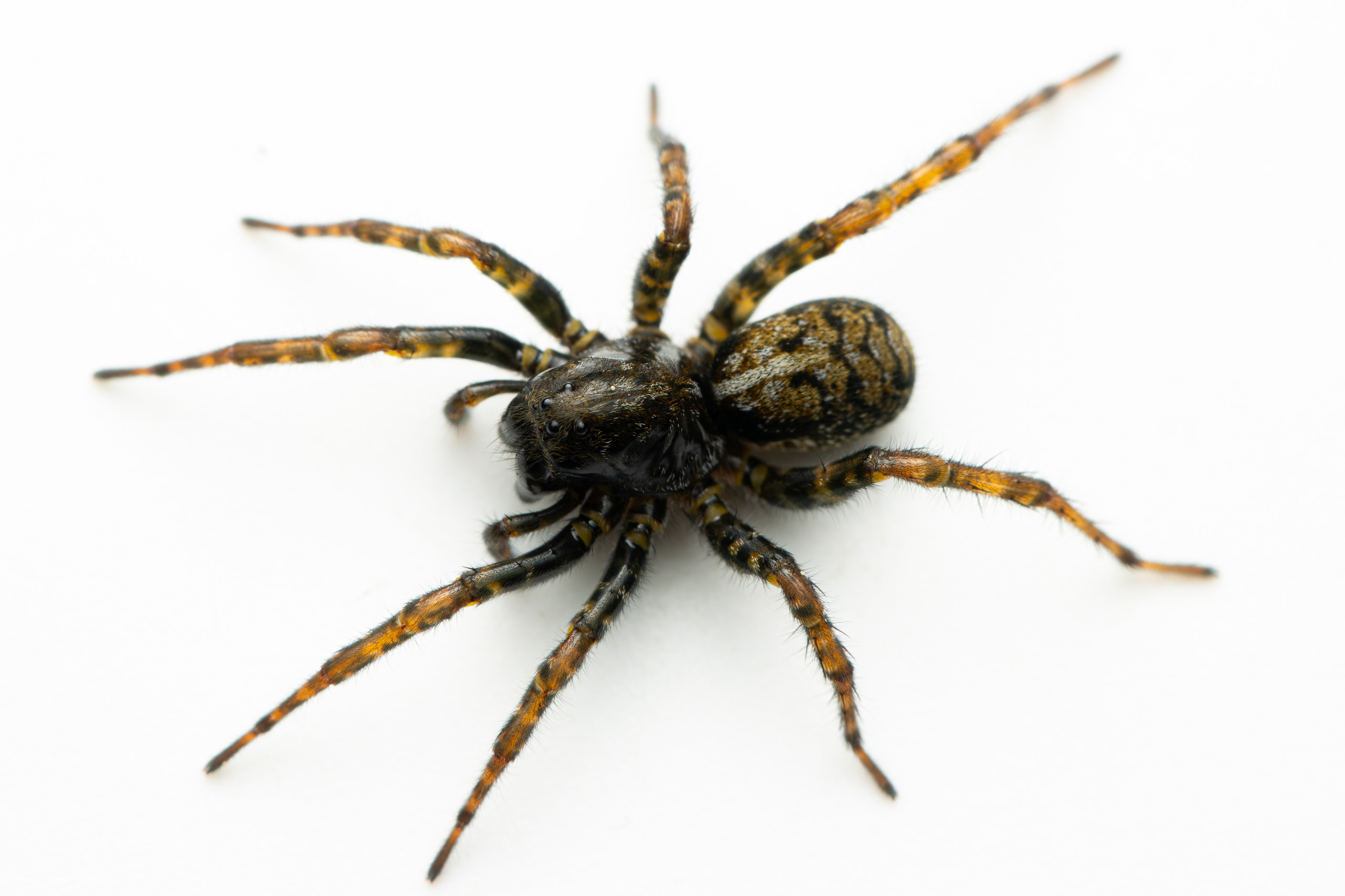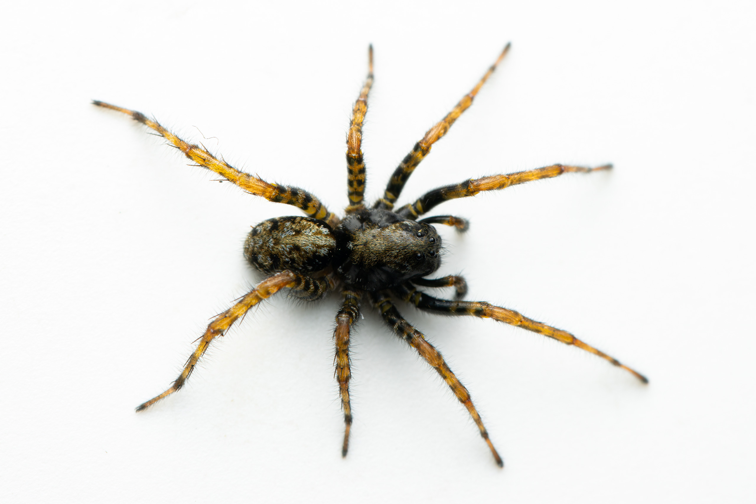 En robust bygget jagtedderkop med stribede ben, og fine markeringer på bagkroppen. Forkroppen er bred og med flere blanke flader mellem partier af farvede hår.