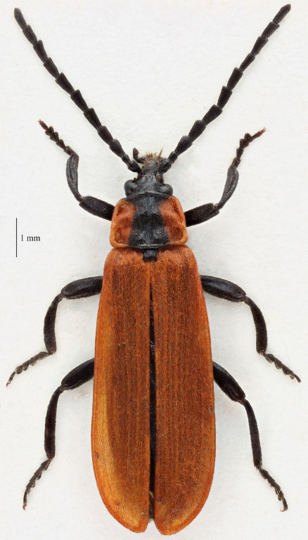 Hovedet snudeformet forlænget. Pronotum med opstående yderrande og med en længdemidtfure, uden tydeligt afgrænsede felter. Vingedækkerne bagtil svagt udvidede, med svage længdestriber, der ikke er synligt punkterede. Stribemellemrummene smalle, svagt hvælvede, men ikke tydeligt ribbeformede. Krop sort, pronotums sider og vingedækkerne røde, med kort nedliggende, ret tæt, tomentagtig, rød behåring. Pronotum lidt bredere end langt, bredest bagtil, på hver side af midtfuren oftest med et ophøjet, udadtil skråt bagudrettet parti, der ikke er skarpt afsat og således ikke tydeligt ribbeformet. Vingedækkerne lange og ret flade.
