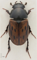Dækvingerne er også relativt brede og hverken bredest fortil eller bagtil. Dækvingerne med svag behåring bagtil. Længdestriber på dækvingerne er næsten flade og fint, men tydeligt, punkterede i midten. Ben sorte med rødbrune fødder. Antennerne er rødbrune med mørk kølle. Bagføddernes første led lige så langt eller lidt længere end andet-fjerde led. Arten er i underslægten Acrossus. Hos hannen er pronotum lidt bredere og forskinnebenets endespore er stump. Hos hunnen er den jævnt tilspidset.